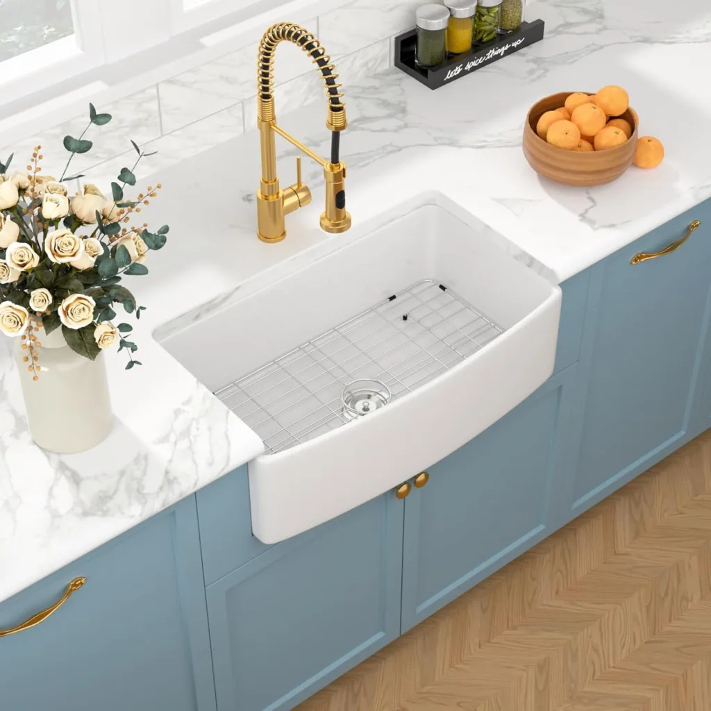 The Sarlai 33 White Farmhouse Kitchen Sink is a top pick for anyone looking to upgrade their kitchen. Made from strong fireclay, this sink is built to last and withstand daily use. With a sleek design and easy-to-clean surface, this sink not only adds a touch of elegance to your kitchen but also makes cleaning